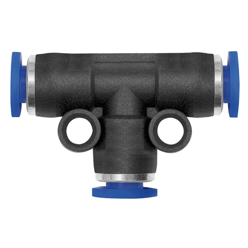 - El conector en T de la serie azul mini es un conector neumático compacto para la ramificación de mangueras de aire comprimido en forma de T en instalaciones neumáticas.
