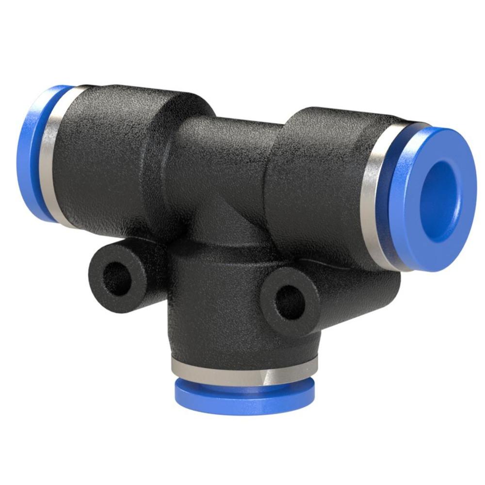 - El conector en T «serie azul» se utiliza para ramificar mangueras en instalaciones neumáticas con el fin de alimentar varias líneas simultáneamente.