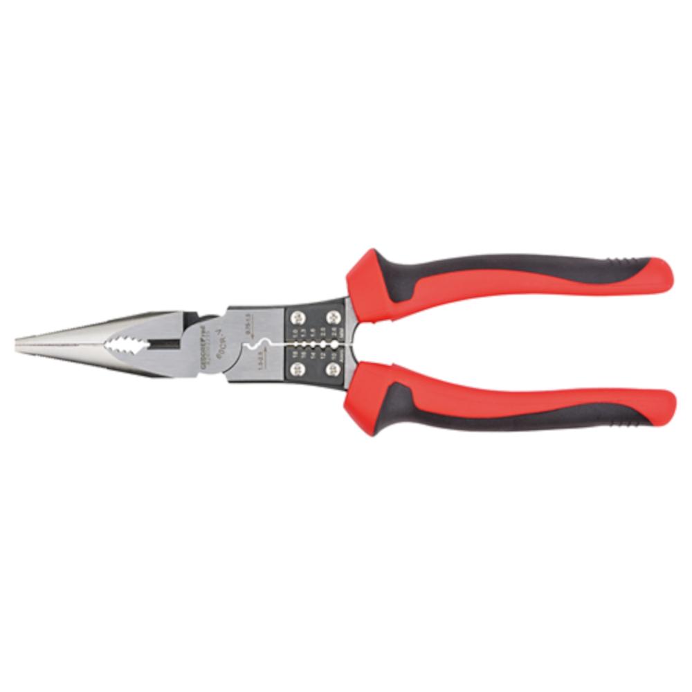 - El alicate de punta plana está equipado con funciones adicionales para cortar, crimpar y pelar, por lo que es adecuado para múltiples aplicaciones. Permite cortar cables de hasta 2 pulgadas de diámetro y es apto para diferentes tipos de cables. La función de engaste integrada cubre secciones transversales de 0,5 a 1 mm² y de 1,5 a 2,5 mm², por lo que es ideal para las conexiones eléctricas habituales. Para el pelado, dispone de zonas específicas para diámetros de cable de 1 a 2,6 mm, lo que permite retirar el aislamiento de forma limpia. El mango ergonómico de dos componentes garantiza un agarre seguro y permite trabajar cómodamente incluso en caso de uso frecuente.