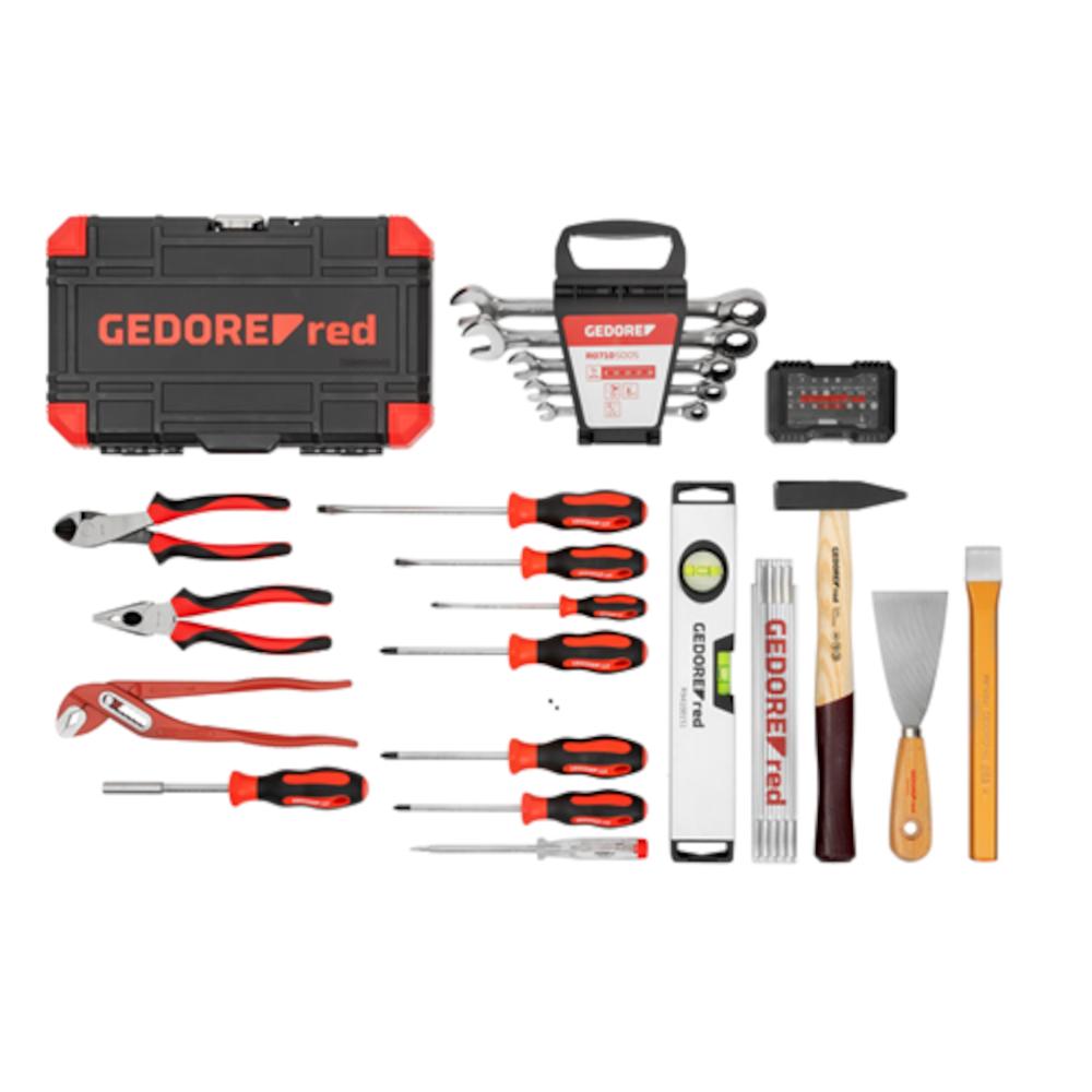 - El GEDORE red es un juego de herramientas orientado a la práctica que ofrece una sólida selección de herramientas manuales habituales para el uso diario. La composición está adaptada a las aplicaciones típicas en taller, montaje y servicio, y facilita un trabajo fiable en diversas tareas. Las herramientas están ordenadas de forma clara en una maleta o caja, lo que permite un acceso rápido. Gracias a su ejecución robusta, el juego es adecuado para un uso regular y ofrece una solución duradera para trabajos básicos.