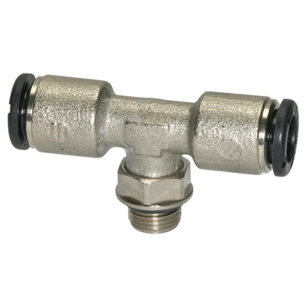 El racor roscado en T es un conector rápido giratorio que permite conectar de forma segura y sin herramientas hasta tres mangueras neumáticas en un punto de bifurcación de 90°.